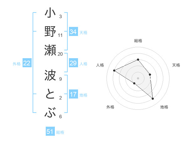 小野瀬 波とぶさんの総格は51画の3点!