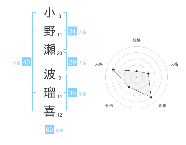 小野瀬 波瑠喜さんの総格は69画の1点!
