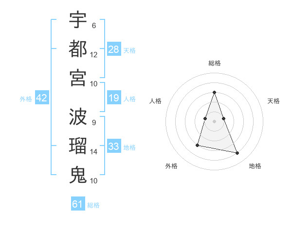 宇都宮 波瑠鬼さんの総格は61画の3点!