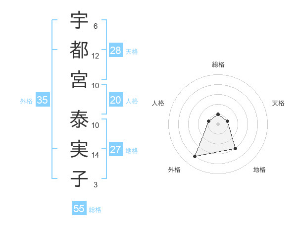 宇都宮 泰実子さんの総格は55画の1点!