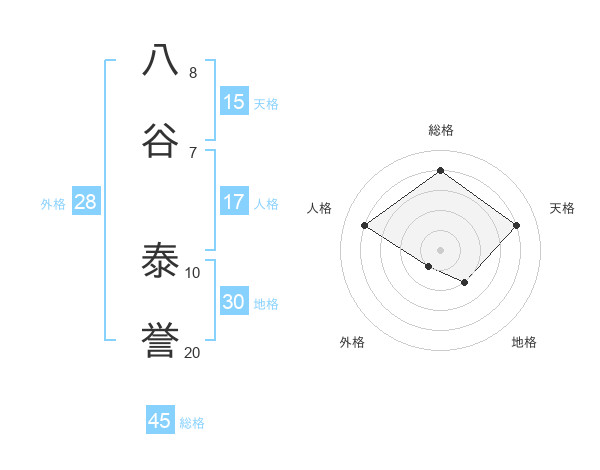 八谷 泰誉さんの総格は45画の4点!