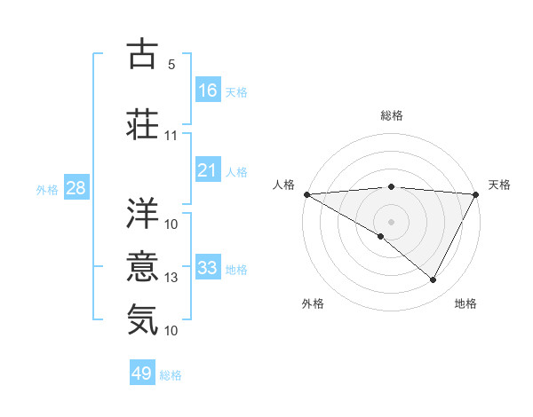 古荘 洋意気さんを姓名の画数から五運を鑑定