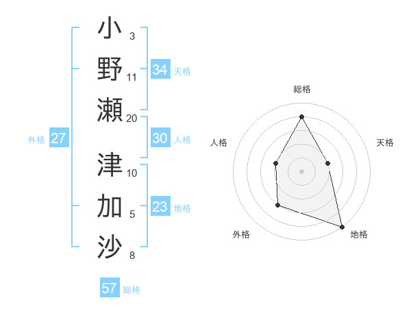 小野瀬 津加沙さんの総格は57画の4点