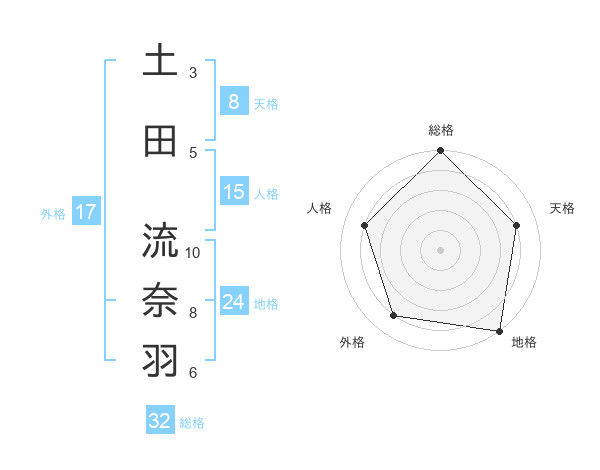 土田 流奈羽さんを姓名の画数から五運を鑑定