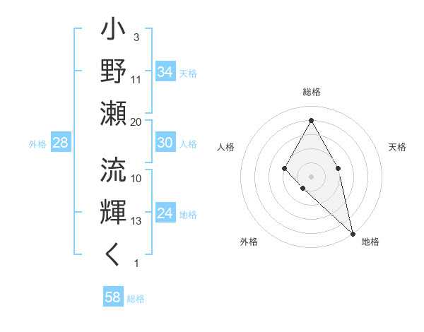 小野瀬 流輝くさんを姓名の画数から五運を鑑定
