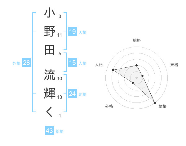 小野田 流輝くさんを姓名の画数から五運を鑑定