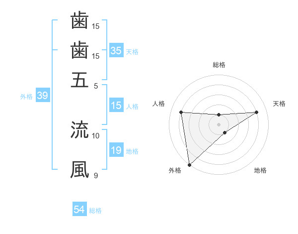 歯歯五 流風さんの外格は39画の5点!
