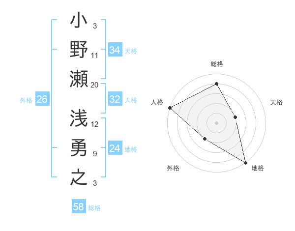 小野瀬 浅勇之さんの総格は58画の4点!