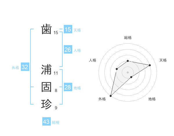 歯 浦固珍さんの総格は43画の2点!