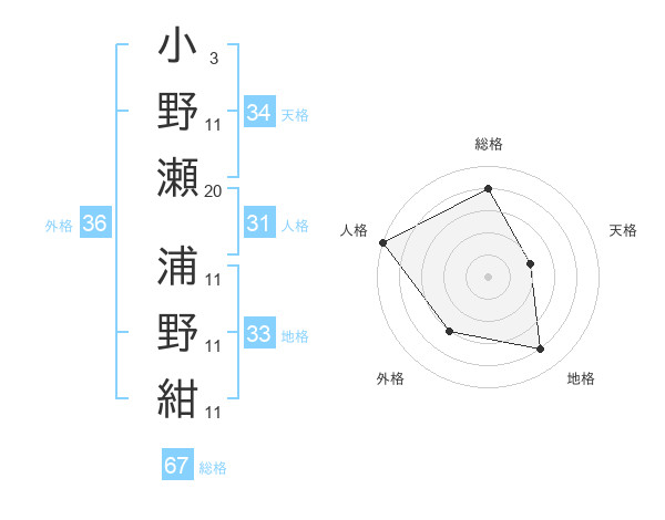 小野瀬 浦野紺さんを姓名の画数から五運を鑑定