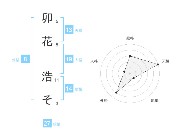 卯花 浩そさんを姓名の画数から五運を鑑定
