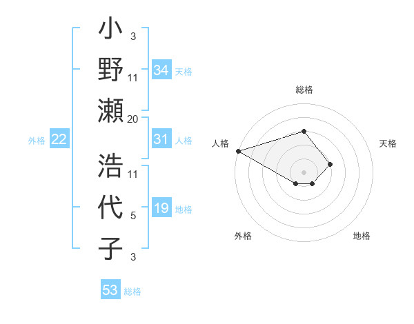 小野瀬 浩代子さんの総格は53画の3点!