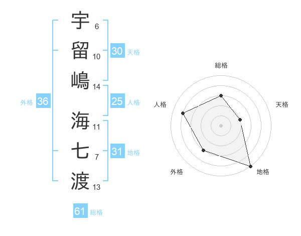 宇留嶋 海七渡さんを姓名の画数から五運を鑑定
