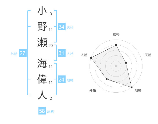 小野瀬 海偉人さんの総格は58画の4点
