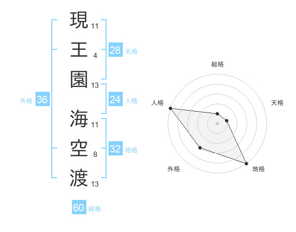 現王園 海空渡さんを姓名の画数から五運を鑑定