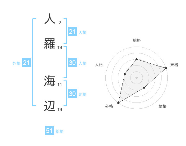 人羅 海辺さんの総格は51画の3点!