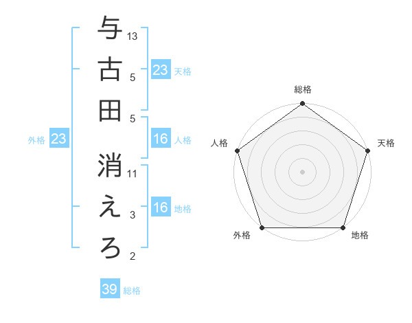 与古田 消えろさんを姓名の画数から五運を鑑定