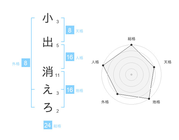 小出 消えろさんの地格は16画の5点!