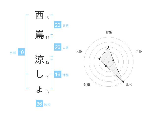 西嶌 涼しょさんの総格は36画の3点!