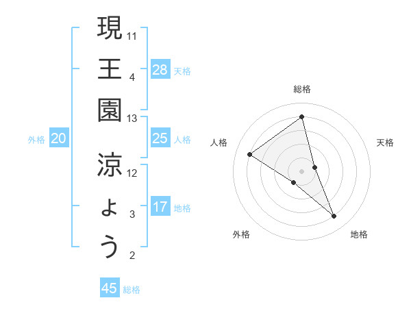 現王園 涼ょうさんの総格は45画の4点!