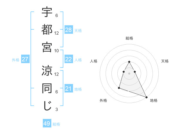 宇都宮 涼同じさんの総格は49画の2点!