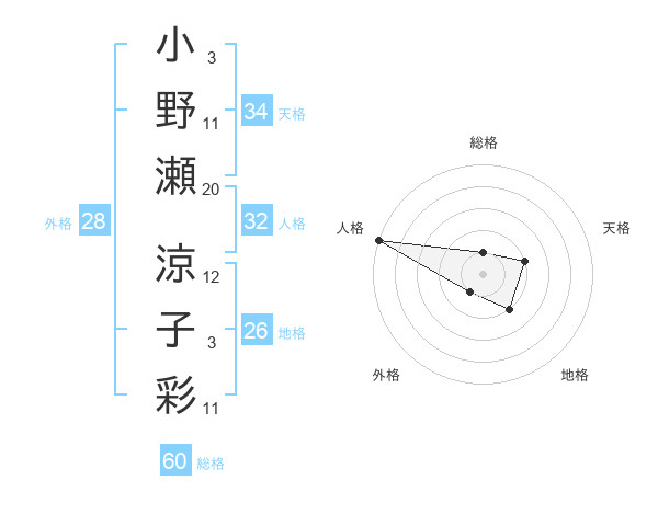 小野瀬 涼子彩さんの総格は60画の1点!