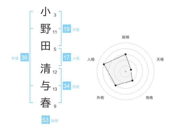 小野田 清与春さんを姓名の画数から五運を鑑定