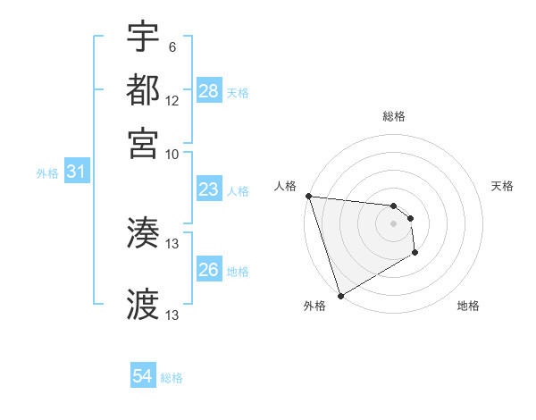 宇都宮 湊渡さんの総格は54画の1点!