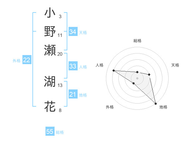 小野瀬 湖花さんを姓名の画数から五運を鑑定