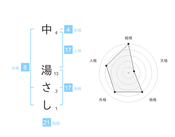 中 湯さしさんの総格は21画の5点!