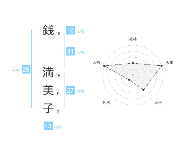 銭 満美子さんの天格は16画の5点!