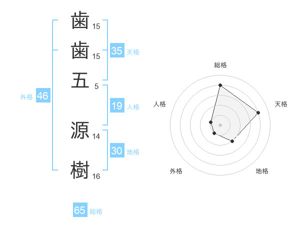 歯歯五 源樹さんの総格は65画の4点!