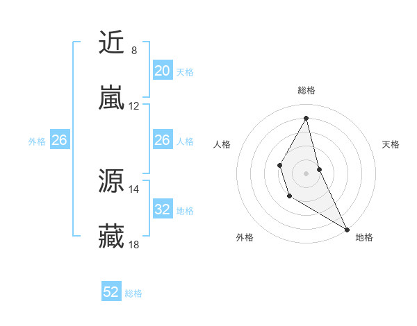 近嵐 源藏さんの総格は52画の4点!