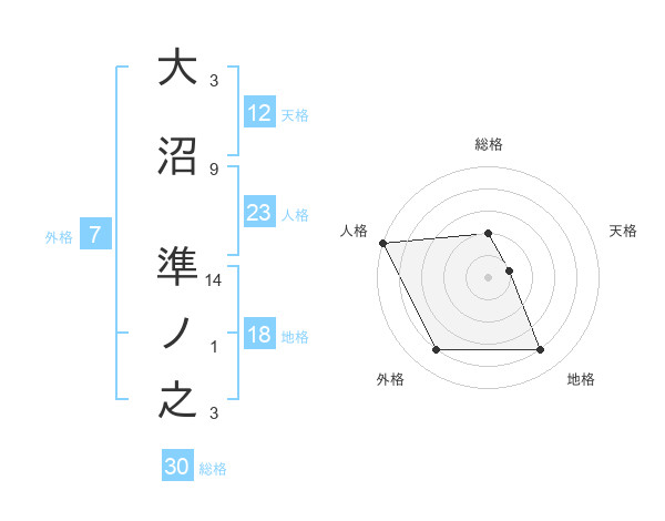 大沼 準ノ之さんを姓名の画数から五運を鑑定