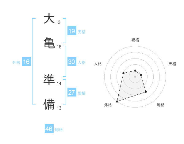 大亀 準備さんの外格は16画の5点!