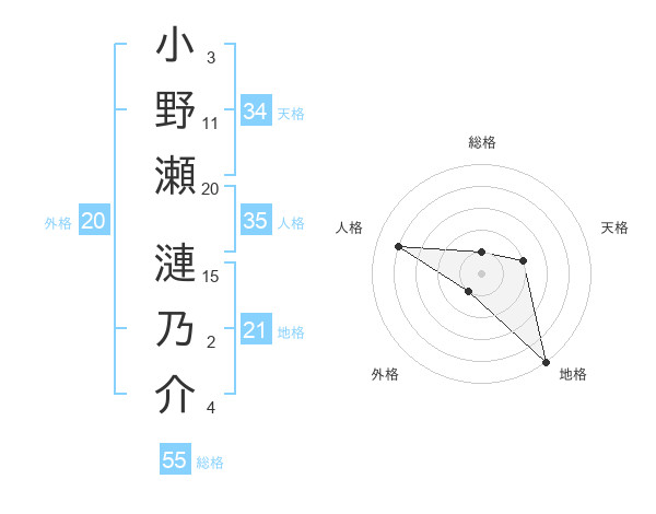 小野瀬 漣乃介さんの地格は21画の5点!