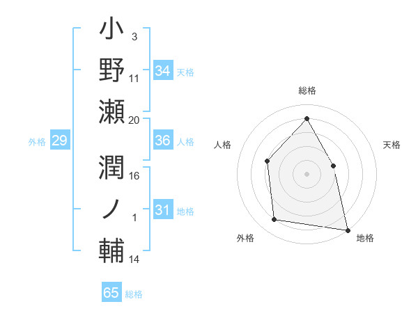 小野瀬 潤ノ輔さんの総格は65画の4点!