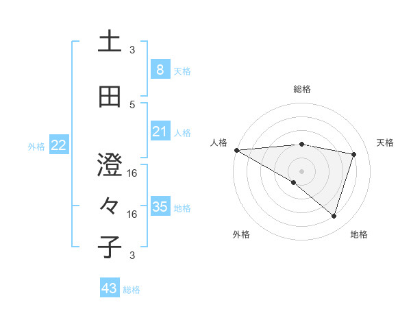 土田 澄々子さんの総格は43画の2点!