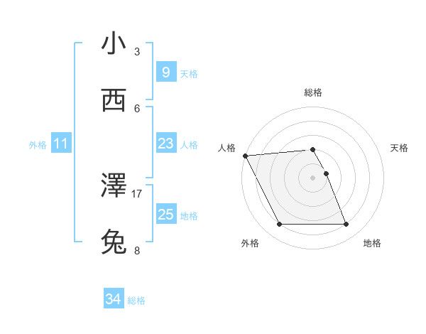 小西 澤兔さんを姓名の画数から五運を鑑定
