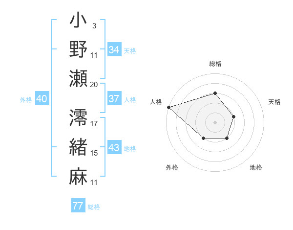 小野瀬 澪緒麻さんの総格は77画の3点!