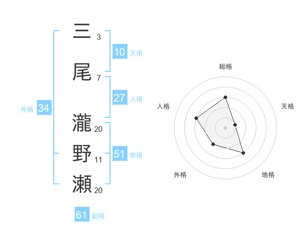 三尾 瀧野瀬さんの地格は51画の3点!