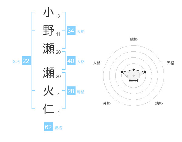 小野瀬 瀬火仁さんの総格は62画の1点!