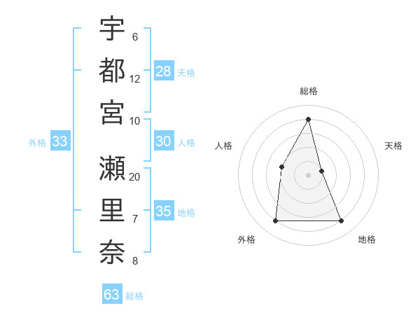 宇都宮 瀬里奈さんの総格は63画の4点!