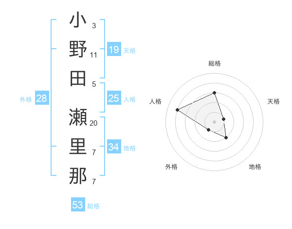 小野田 瀬里那さんの総格は53画の3点!