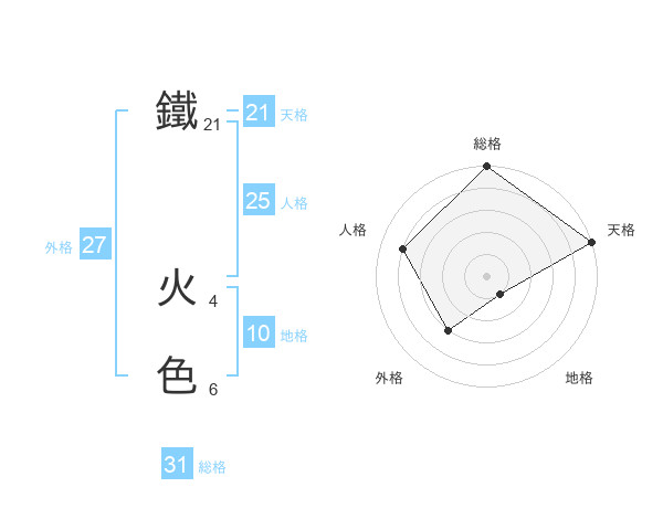 鐵 火色さんの天格は21画の5点!