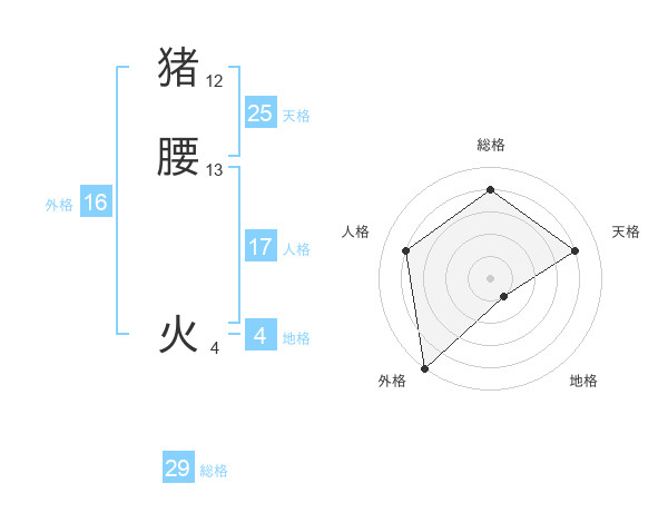 猪腰 火さんの総格は29画の4点!