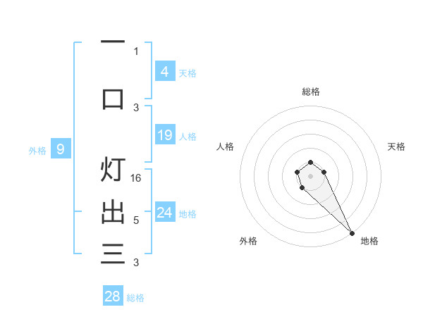 一口 灯出三さんの総格は28画の1点!