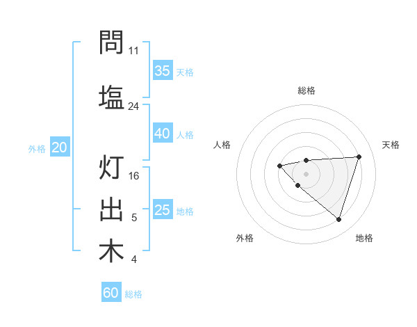 問塩 灯出木さんを姓名の画数から五運を鑑定