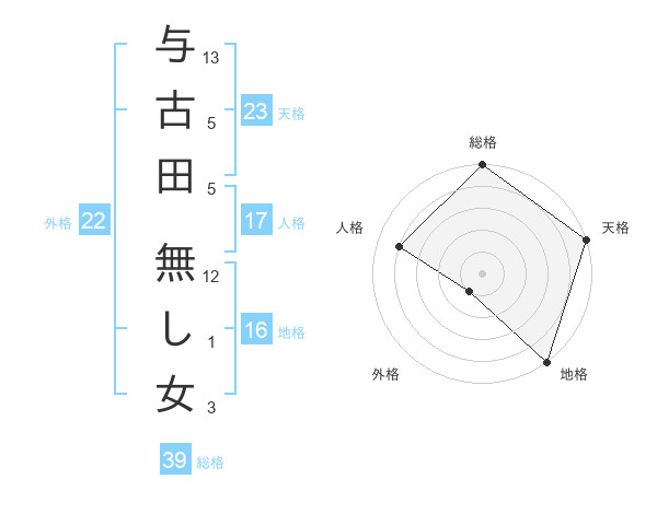 与古田 無し女さんを姓名の画数から五運を鑑定