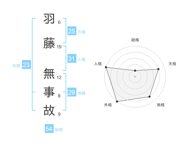 羽藤 無事故さんの総格は54画の1点!
